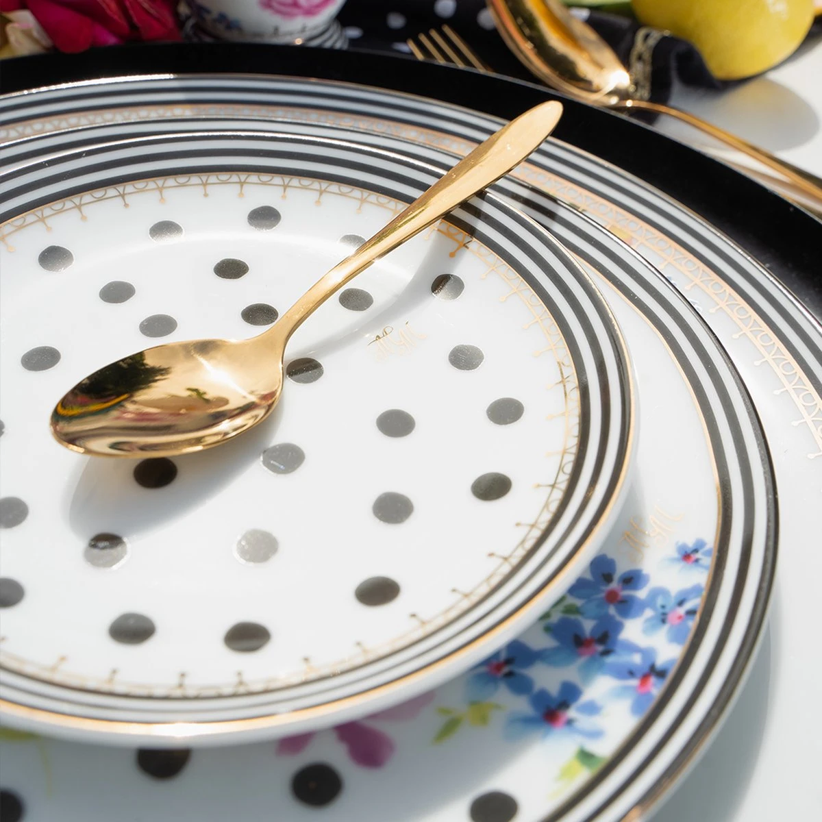 Met de complete serviesset van Melli Mello ben je voorbereid op álles. Met deze set heb je in één keer alles in huis wat je nodig hebt om een feestje van elke maaltijd te maken! Mix & match de diverse borden en schaaltjes voor een verschillende look. De vrolijke bloemen in blauwe, roze, turkoois en lila in combinatie met de moderne zwart-witte accenten maken een feestje van je gedekte tafel. Subtiele gouden details stralen luxe uit en maken het plaatje compleet. Verras de mensen om je heen en tover je huis om tot een restaurant. Met deze complete set ziet je tafel er geweldig uit! Je kunt kiezen tussen de Nora-set met bloemen, of de Nora dots-set, waarbij zowel het dinerbord als het dessertbord een trendy polka dot hebben.